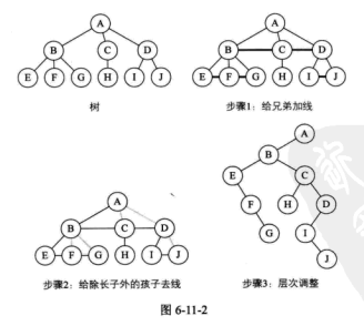 - 去线。对树中每个结点,只保留它与第一个孩子结点的连线,删除它与其他孩子结点之间的连线。(叶子节点没有孩子结点,不用去线)